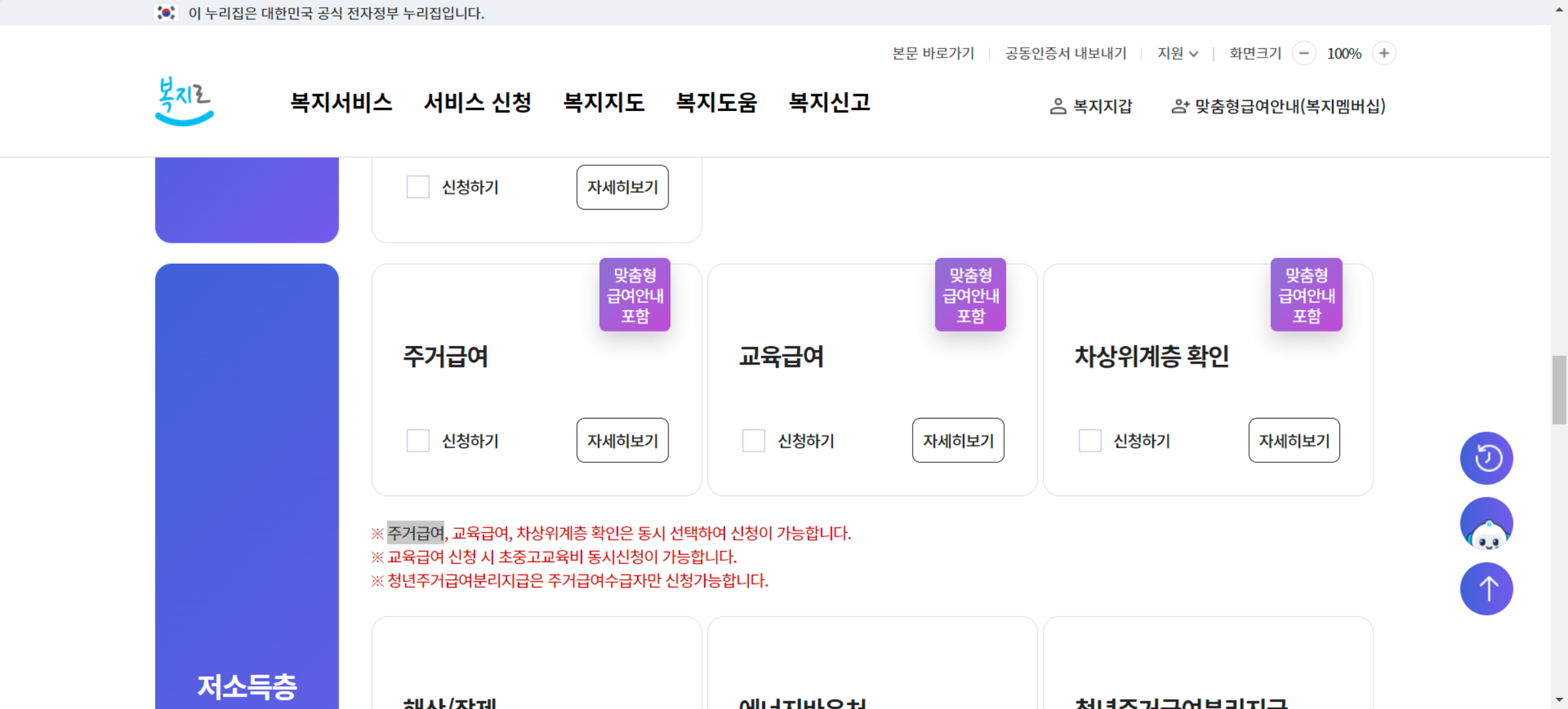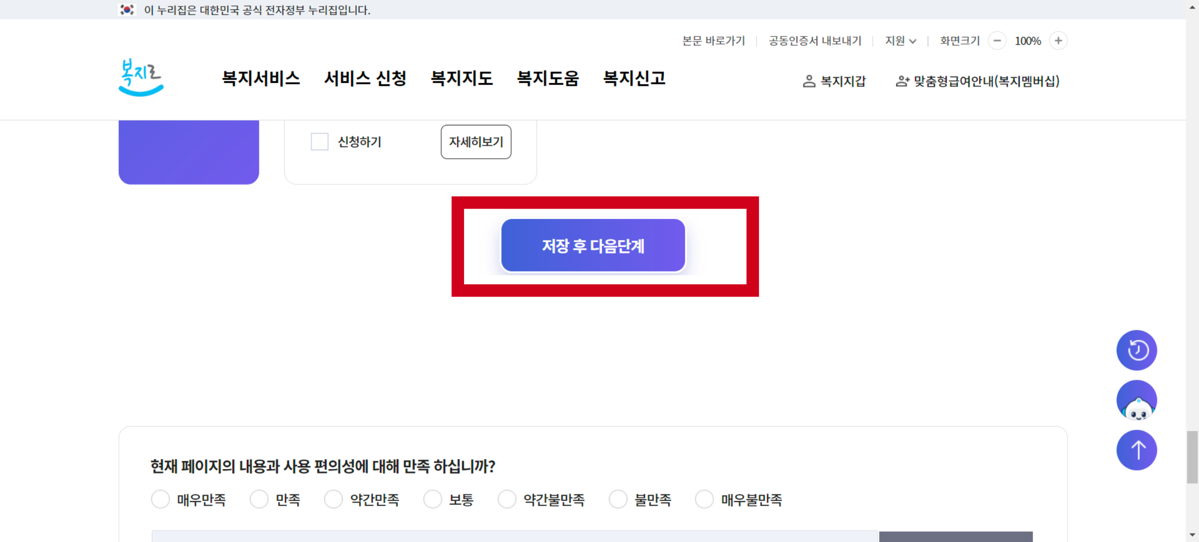 - 하단에 있는 '지금 바로 신청하기' 버튼 클릭 후 복지로 신청 페이지 접속