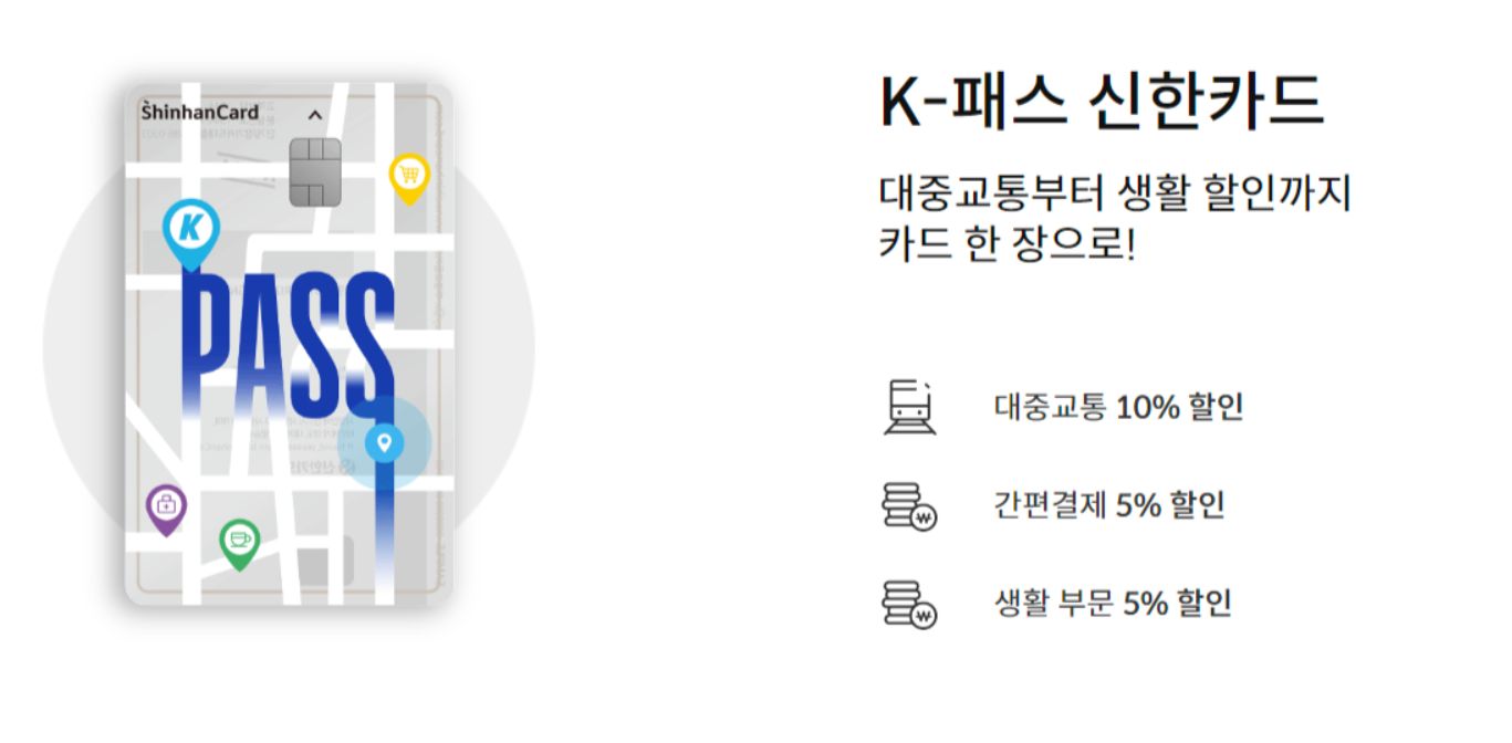 - 신한카드사의 K패스 신용카드는 버스와 지하철 이용 시 10%의 할인을 받을 수 있으며 간편 결제 한해 5% 할인을 적용받을 수 있습니다. 추가적으로 배달앱, 편의점, 그리고 커피 전문점에서도 5% 할인 혜택을 받을 수 있습니다.